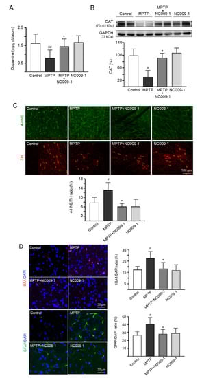 2.4. Effect of NC009-1 on Dopamine, DAT, 4-HNE/TH, IBA1, and GFAP Levels in MPTP-Treated Mice