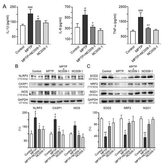 Up-regulated expression of mature IL-1β has been reported in the SN of an acute MPTP-induced PD mouse model and in cerebrospinal fluid of PD patients [26]. Moreover, MPTP-driven NLRP3 up-regulation in microglia plays a central role in DAergic neurodegeneration [27]. We thus examined the expression of inflammatory cytokines and NLRP3. As shown in Figure 5A,B, IL-1β (162%, p < 0.001), IL-6 (174%, p = 0.048), TNF-α (210%, p < 0.001), NLRP3 (216%, p = 0.028), CASP1 (203%, p = 0.025), and iNOS (159%, p = 0.046) were up-regulated in MPTP-treated mice, whereas treatment with NC009-1 down-regulated IL-1β (126%, p = 0.048), IL-6 (103%, p = 0.015), TNF-α (123%, p = 0.008), NLRP3 (132%, p = 0.048), CASP1 (115%, p = 0.047), and iNOS (90%, p = 0.025). The expression levels of IL-1β (113%), IL-6 (82%), TNF-α (107%), NLRP3 (133%), CASP1 (94%), and iNOS (76%), in NC009-1-treated mice were comparable to the controls.