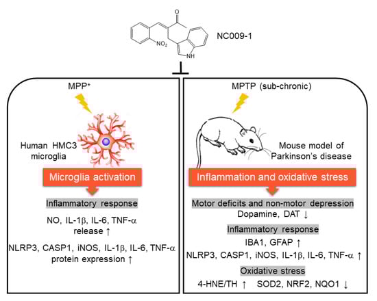 Microglia, the innate immune responders of the central nervous system, are key mediators of neuroinflammation in neurodegenerative diseases [28]. The pronounced activation of microglia in the brains of PD patients up-regulates inflammatory factors, and increases reactive oxygen species (ROS) and neuroinflammation [29,30]. Here we demonstrate that indole derivative NC009-1 alleviates MPP+-induced production of inflammatory mediators in HMC3 microglia. By down-regulating neuroinflammation and up-regulating cellular redox signaling, NC009-1 ameliorates behavioral impairments, increases dopamine and dopamine transporter levels in the striatum, and reduces oxidative stress as well as activation of microglia and astrocytes in the ventral midbrain of the sub-chronic MPTP-induced mouse model. The study results strengthen the roles of oxidative stress and neuroinflammation in PD pathogenesis, suggesting the potential of NC009-1 for the treatment of PD.
