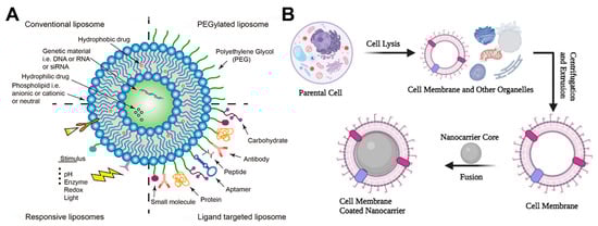 Nanotechnology has been increasingly used for drug delivery to further improve clinical efficacy. Surface modification of liposomes can prolong blood circulation time and enhance targeted drug delivery. Most nanoparticle-based delivery methods concentrate largely on synthetic techniques, which frequently need cumbersome chemical production [108]. In addition, synthetic materials are not satisfactorily biocompatible and are difficult to manufacture on a large scale. With the in-depth study of nanomedicine, it has been discovered that combining synthetic nanoparticles with natural biomaterials, such as cell membranes, directly imparts highly complex functional surfaces and effective biological interfaces with nanocarriers. The platform of cell membrane-camouflaged nanoparticles has emerged as an innovative delivery method with the potential to enhance therapeutic effectiveness for the treatment of a range of ailments. Cell membrane-coated liposomes are a new class of biomimetic nanoliposomes that combine the customizability and flexibility of synthetic materials, as well as the functionality and complexity of natural materials [109]. They offer long cycle times, high biocompatibility, targeting capabilities, and simultaneous multidrug delivery.