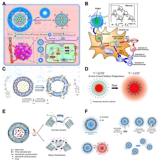 Demonstration diagrams of various stimulus-responsive liposomes. (A) Liposomes for enzyme-triggered drug delivery. Reproduced with permission from [89]. Copyright 2020, Dove Medical Press Limited. (B) Liposomes for PH-triggered drug delivery. Reproduced with permission from [90]. Copyright 2013, Elsevier B.V. (C) Reactive oxygen species (ROS)-responsive liposomes. Reproduced with permission from [91]. Copyright 2020, American Chemical Society. (D) Illustration of drug release from polymer-modified thermosensitive liposomes. Reproduced with permission from [92]. Copyright 2013, Elsevier B.V. (E) Liposomes for light-triggered drug delivery. Reproduced with permission from [93]. Copyright 2010, Taylor & Francis. (F) Liposomes for ultrasound-triggered drug delivery. The figure describes several ultrasound-mediated drug release mechanisms, including ultrasound-induced cavitation, focused ultrasound, and acoustic radiation force flow. Reproduced with permission from [94]. Copyright 2014, Elsevier B.V.