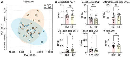 HBP and REF subjects did not differ in characteristics other than BP (Table 1). Systolic blood pressure was used as the dependent variable for confounder analyses against the independent clinical variables. Although chronic kidney disease was a confounding factor, there was no significant regression between BP and chronic kidney disease (p = 0.06) when adding other characteristics. Thus, no independent variables affected BP in our cohort. PCA analysis of the transcriptomes of all samples revealed no outliers (Figure 1A). In addition, the expression of phenotypic markers of cell populations of the colon were comparable in REF and HBP groups in both the colonic epithelium (Figure 1B, p > 0.05) and organoids (Figure S1). These markers included ALPI (enterocytes), MUC2 (goblet cells), CHGA (enteroendocrine cells), LGR5 (CBR stem cells), LZY (Paneth cells) and BMI1 (+4 cells: secretory and enteroendocrine progenitors, +4 stem cells, Paneth cell precursors/label-retaining cells). Together, this indicates the consistency of colon biopsies and sequencing among subjects and groups, thus all samples were carried forward into downstream analyses.