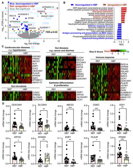 Comparison of the transcriptomes of colons of REF and HBP subjects. (A) Volcano plot showing differentially expressed genes (DEGs) in colonic epithelium from REF (n = 19) with HBP (n = 16) subjects. FDR-corrected p < 0.05, blue circles, downregulated DEGs; red circles, upregulated DEGs in HBP subjects; gray circles, genes with no difference in expression. (B) Pathways significantly enriched in colon of HBP subjects compared with control subjects (FDR-corrected p < 0.05). NES: normalized enrichment score. Negative NES (blue bar) shows downregulated pathways and positive NES (red bar) shows upregulated pathways in HBP subjects. (C) Supervised heat maps of genes in the enriched gene sets. Enriched gene sets were determined by gene set enrichment analyses performed using supervised hierarchical clustering in Heatmapper with FDR-corrected p < 0.05, upregulated (red) gene and downregulated (green) gene in HBP vs. REF subjects. (D) mRNA expression of representative genes in colonic tissues from HBP and REF subjects by qPCR. Fold changes relative to REF group. GADPH expression was used for normalization. Values are means ± SEM, * p < 0.05, ** p < 0.01, *** p < 0.001, unpaired t test or Mann–Whitney U test.