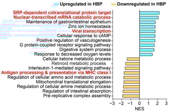 Pathways significantly enriched in colonic organoids from HBP subjects compared with REF subjects (FDR-corrected p < 0.05). NES: normalized enrichment score. Negative NES (Light blue bar) shows downregulated pathways and positive NES (Yellow bar) shows upregulated pathways in colonic organoids from HBP subject.