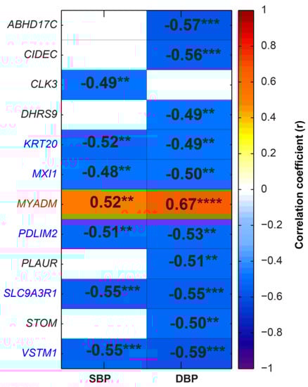 Correlation analysis between blood pressure and expression of the DEGs in REF (n = 19) and HBP subjects (n = 16). Pixel map representation of the correlation between blood pressure and expression of the DEGs in REF and HBP subjects. Positive r indicates the positive correlation and negative r indicates the negative correlation. (** p < 0.01, *** p < 0.001 and **** p < 0.0001, cutoff value |r| is 0.48).