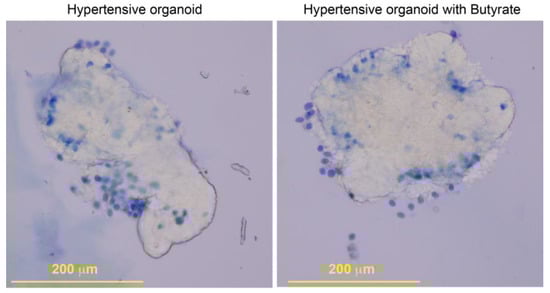 Butyrate-producing bacteria are depleted in hypertensive animals and patients [,]. Furthermore, butyrate supplementation alleviates HTN pathophysiology in a preclinical model [,]. These findings led us to determine if butyrate treatment would rescue impaired gene expression in HBP subjects. We modeled this in human colon organoids since testing in human subjects was not possible. Three-dimensional organoids from crypts containing the colonic stem cells of subjects with HBP (Figure 5) were established and treated with 3 mM butyrate for 24 h.