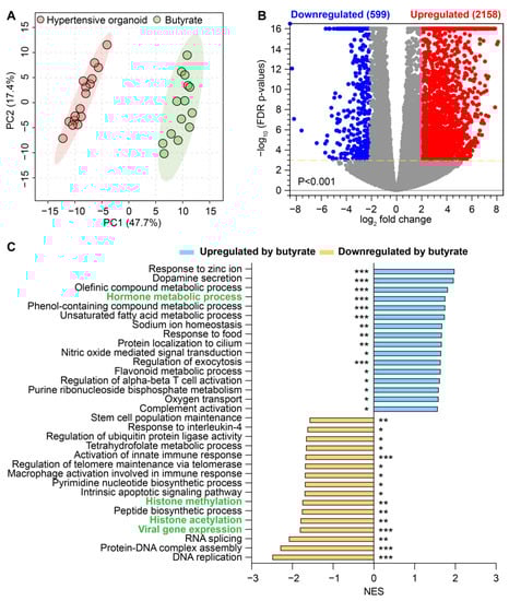 Comparison of the transcriptomes of colonic organoids without and with butyrate in HBP subjects. (A) Principal component analysis (PCA) plot based on complete expression profiles. Light red region is for 95% confidence interval of human organoids without butyrate (n = 14) and light green region is for 95% confidence interval of human organoids with butyrate (n = 16) in HBP subjects. (B) Volcano plot showing differentially expressed genes (DEGs) in human organoids without and with butyrate in HBP subjects. FDR-corrected p < 0.001, absolute fold change ≥ 4. Blue circles, downregulated DEGs; red circles, upregulated DEGs in human organoids with butyrate; gray circles, genes with no difference in expression. (C) Pathways significantly enriched in human organoids with butyrate compared to without butyrate treatment. Negative NES (blue bar) shows downregulated pathways and positive NES (yellow bar) shows upregulated pathways in human organoids with butyrate. Green-highlighted pathways were dysregulated in HBP colonic tissue, whose pathways could be restored by the butyrate treatment. FDR-corrected * p < 0.05, ** p < 0.01, *** p < 0.001.