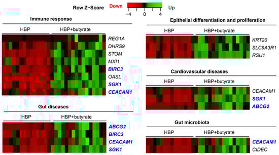 High-throughput RNA sequencing followed by PCA analysis revealed a clear distinction between the transcriptomes of untreated and butyrate-treated organoids from HBP subjects (Figure 6A). We observed 3831 upregulated genes (red dots) and 702 downregulated genes (blue dots) in butyrate-treated organoids (Figure 6B). GSEA of these differentially expressed genes disclosed that gene sets for histone modification were significantly inhibited by butyrate in organoids from HBP subjects (Figure 6C). They included gene sets associated with histone methylation, with a normalized enrichment score (NES = −1.7663, adjusted p = 0.0089, e.g., PRDM5 and BRCA1) and histone acetylation (NES = −1.8117, adjusted p = 0.002, e.g., MSL3 and JADE2) (Figure 6B). Additionally, the gene set for viral gene expression was downregulated by butyrate in the organoids of HBP subjects (NES = −1.8241, adjusted p = 0.00096, e.g., MDFIC and TRIM27): it was enriched in the colonic tissue of the HBP group compared to the REF group (Figure 2B and Figure 6C). Hormone metabolic process functions as a determinant of both the beneficial and detrimental effects of sex hormones on the cardiovascular system []; it was upregulated in the HBP group by butyrate (NES = 1.7658, adjusted p = 0.00094, e.g., IYD and RETSAT) but impaired in the colonic tissue of the HBP group compared to the REF group (Figure 2B and Figure 6C). Furthermore, RPKM data demonstrated that butyrate activated the expression of genes related to epithelial differentiation and proliferation (KRT20 and SLC9A3R1), immune response (REAG1A, DHRS9, STOM, MXI1, BIRC3, OASL, CEACAM1 and SGK1) and gut microbiota (CIDEC and CEACAM1) in HBP organoids (Figure 7), whose expression was downregulated in the colon tissues of HBP subjects. Of these genes, some were involved in cardiovascular (ABCG2, CEACAM1 and SGK1) and gut diseases (REAG1A, ABCG2, BIRC3, CEACAM1 and SGK1), and others were potential drug targets (ABCG2, BIRC3, CEACAM1 and SGK1) (Figure 7). Taken together, these data suggest that butyrate treatment recues key functional genes in the organoids from HBP subjects. This is consistent with butyrate’s multifunctional effects (such as anti-inflammatory activity, a reduction in oxidative stress, etc.) in the improvement of gut barrier functions.