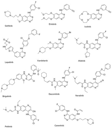 As second-generation EGFR TKIs, several 4-anilinoquinazoline and 4-anilinoquinoline compounds have been synthesized and tested. Targeting other human epidermal growth factor receptors (HER-family members such as HER2) and dose-limiting toxicity caused by targeting both mutant T790M and wild-type EGFR are two important limitations for the continued clinical development of these drugs [22].