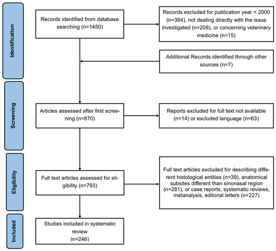 In total, our search yielded 1450 articles. A further manual check of the references included in the articles was performed, adding 7 articles. We excluded 208 articles for not dealing directly with the investigated issue, 364 articles for publication year < 2000, 14 records for the full text not being available, 63 for being written in a language different than the included ones, and 15 for being about veterinary medicine. Finally, 793 full text articles were assessed for eligibility and 39 were excluded for describing different histological entities, 281 for anatomical subsites different than sinonasal region, and 227 for being case reports, systematic reviews, metanalyses, or editorial letters. Finally, 246 articles were included in the qualitative analysis. The details of the systematic search are shown in Figure 1. Since the large majority of the retrieved articles examined SNSCC, ITAC, and ONB, the discussion was focused on these three pathological entities.