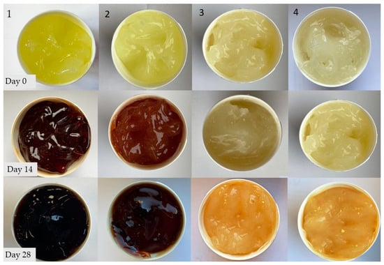 The progressive decomposition of TC could also be observed from the optical colour changes of the hydrogels during the observation period. In the case of Formulation 1 with a pH value of 8.36, the colour changed very rapidly from light yellow on the first day of observation through dark yellow and orange to dark maroon on day 28. TC in the second formulation with a pH value of 8.04 also showed colour changes, but less intense than was the case with sample 1, which reached a brown colour on day 28. Samples 3 and 4, as well as the second A–C series, maintained the yellow colour of the formulation throughout, with a slightly stronger shade on the last day of analysis. The appearance of a dark maroon colour in samples 1 and 2 is related to the alkaline pH of these preparations, as confirmed by Davies’ studies evaluating the formation of quinones in alkaline environments [
