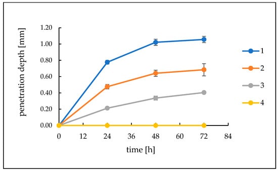 Scaled PVC tubes with an inner diameter of 4 mm were used to evaluate the activity of hydrogel formulations against model sebum components. These tubes acted as a hair follicle model. The scaled pipes were filled with liquid sebum to a certain level and the liquid was allowed to solidify. After the sebum solidified, 0.5 mL of hydrogel preparations were placed on its surface, and the ends of the tubes were plugged with a plastic compound to prevent evaporation of water from the hydrogel. Activity observations were conducted for 72 h at 24 h intervals. Six measurements were taken for each recipe, so the average value of the product layer depth and standard deviation (SD) could be determined. The depth of the reactive sebum layer was determined using a digital measuring device (digital calliper Powerfix IAN Z22855) with an accuracy of 0–100 mm ± 0.02 mm. In addition, digital macro photographs were also taken using a Samsung A53 camera, Macro 5 Mpx, 1.12 µm, FF and f/2.4.