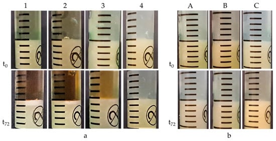 The second phenomenon evaluated in this study was the activity of the formulations against model sebum components. Proliferating within the hair follicles, the pathological skin microbiome causes local inflammation with painful skin lesions. Lingering sebum in the hair follicles effectively inhibits therapeutic agents aimed at eliminating bacteria and inhibiting inflammation from reaching these areas. Previous studies showed that alcoholamines react with model sebum components such as stearic acid, leading to saponification and the appearance of a light layer of products on the sebum surface (Equation (1)) [
