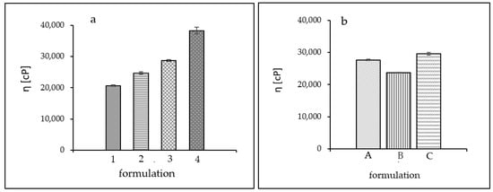 The viscosity of all hydrogels was measured using a Brookfield rotational viscometer (Middleboro, MA, USA). For Formulations 1–4, spindle 6 and a speed of 50 RPM were used. For hydrogels A–C, a spindle 5 operating at 20 rpm was used. Each measurement was repeated five times so that the average value of hydrogel viscosity and standard deviation (SD) could be calculated.