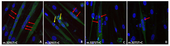 Fusion events between control MABs and MUT1 or MUT2 mutant myotubes. (A,B) control MABs fusion with m.3291T>C myotubes (red arrows), and control MABs fusion with MUT2 (m.3291T>C) MABs (yellow arrows) (C,D) control MABs fusion with MUT1 (m.3271T>C) myotubes (red arrows).