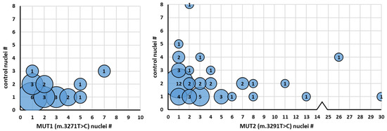 Individual fusion ratios of control MABs with m.3271T>C and m.3291T>C MABs and myotubes. X-axis: number of mutant nuclei per myotube, Y-axis: number of control nuclei per myotube. The number of observations is shown in circles. MUT1: n = 23, MUT2: n = 52.