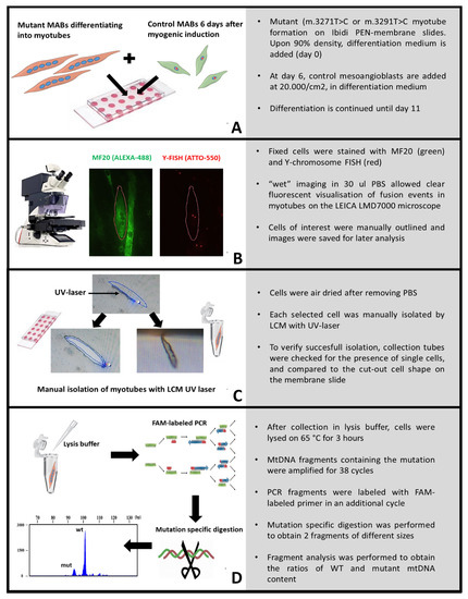 Schematic overview of fluorescent single-cell isolation and analysis. (A) mutant myotube culture and mixing of control MABs in Ibidi PEN-membrane slides for LCM, (B) representative images of selected cell-based multinucleated morphologies and subsequent selection on the presence of control nuclei (red Y-signal) in PBS, (C) laser capture process of selected cells after dehydration in brightfield mode, (D) cell manipulation protocol for subsequent mtDNA mutation load analysis.