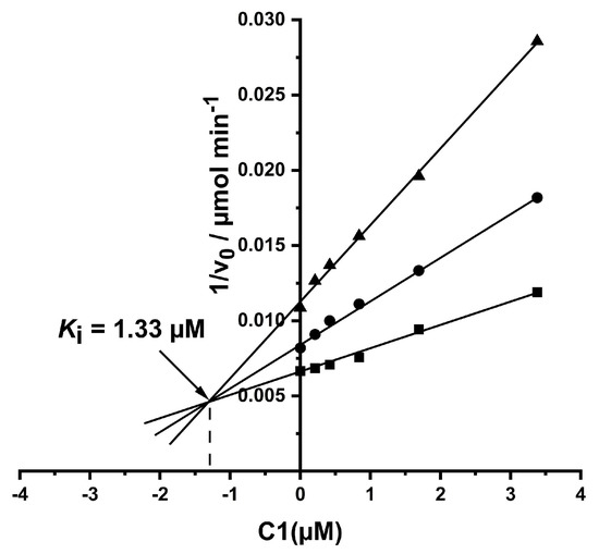 Determination of the type of inhibition and inhibitory constant (Ki) for C1 towards hsBChE. The concentrations of the substrate acetylthiocholine were 0.125 mM (triangles), 0.25 mM (circles), and 0.5 mM (squares).