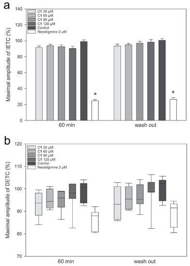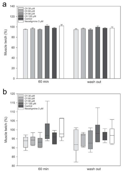 Effects of C1 on nerve-evoked and directly muscle-elicited tetanic contraction of isolated mouse nerve-hemidiaphragm preparation. The effects of increasing concentrations of C1 (30, 60, 90 µM, and 120 µM), 0.104% (v/v) DMSO (control), and 3 µM neostigmine (positive control) on nerve-evoked and directly muscle-elicited tetanic contraction of isolated mouse nerve-hemidiaphragm preparation after 60 min of exposure and after wash-out. (a) Values of nerve-evoked tetanic contraction are expressed as mean ± SE from 6–7 different hemidiaphragms. (b) Box plots indicate the median values of the directly muscle-elicited tetanic contraction obtained from 6–7 different hemidiaphragms, as well as the interquartile range, with whiskers showing the entire range of data, and all outliers. * p ≤ 0.05 versus control (0.104% (v/v) DMSO).