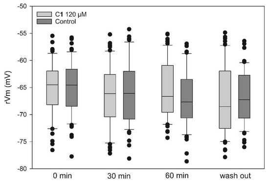 C1 at a concentration of 120 µM had no effect on rVm recorded in the end-plate regions of surface muscle fibers after 30 and 60 min of exposure (Figure 4). The median values of rVm were −64.49 mV (IQR: −68.19 to −61.96) under control conditions (i.e., at time zero, immediately before C1 application), −66.13 mV (IQR: −70.44 to −62.60), and −66.63 mV (IQR: −69.57 to −60.92), 30 and 60 min after exposure to 120 μM of C1. These results indicate that C1 has no myotoxic or depolarizing effect on skeletal muscle fibers.