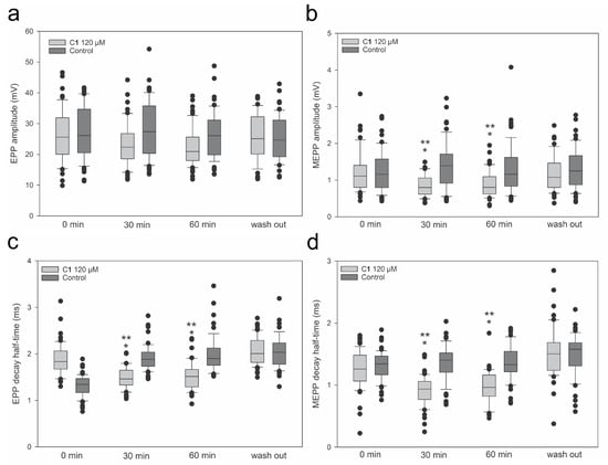 Time-dependent effect of C1 at 120 μM on the amplitude of end-plate potential, amplitude of miniature end-plate potential, decay half-time of end-plate potential, and decay half-time of miniature end-plate potential of isolated mouse hemidiaphragm fibers. (a) Amplitude of end-plate potential, (b) amplitude of miniature end-plate potential, (c) decay half-time of end-plate potential, and (d) decay half-time of miniature end-plate potential. The neuromuscular preparations were exposed to a 0.104% (v/v) DMSO concentration (control) and to the highest C1 concentration (120 μM). Measurements were performed before (time 0) and 30 and 60 min after application of the highest C1 concentration or 0.104% (v/v) DMSO (control), and after washing the preparation with standard Krebs-Ringer physiological solution for about 15 min. Box plots indicate the median values of the data obtained from 4 different hemidiaphragms (n = 7–10 fibers from each), as well as the interquartile range, with whiskers showing the entire range of data, and all outliers. * p ≤ 0.05 versus control (0.104% (v/v) DMSO); ** p ≤ 0.05 versus time 0 (before applicaton of the complex).