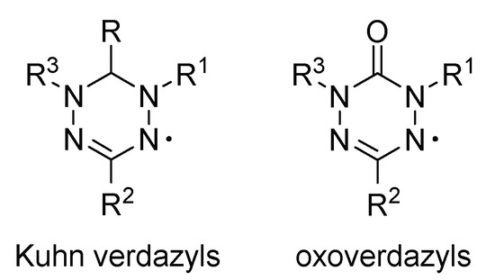 - Kuhn, R.; Trischmann, H. Über Verdazyle, eine neue Klasse cyclischer N-haltiger Radikale. Monat. Chem. 1964, 95, 457–479. [Google Scholar] [CrossRef]
