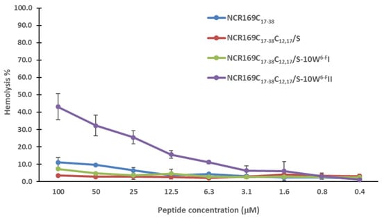 An oxidized form of NCR169 has been shown to bind to negatively charged bacterial phospholipids [32], so it is possible that the antimicrobial activity of NCR169C and their derivatives may cause membrane damage. However, the interaction of these peptides with bacterial membranes does not necessarily mean membrane damage of human cells. Therefore, we tested the potential hemolytic activity of NCR169C17–38, NCR169C17–38C12,17/S, and the two most active derivatives, NCR169C17–38C12,17/S-10W6-FI and NCR169C17–38C12,17/S-10W6-FII, against human red blood cells. None of the peptides provoked hemolysis in the range of MBCs and not even up to a concentration of 100 µM except NCR169C17–38C12,17/S-10W6-FII, which caused mild hemolysis at higher concentrations (Figure 1).