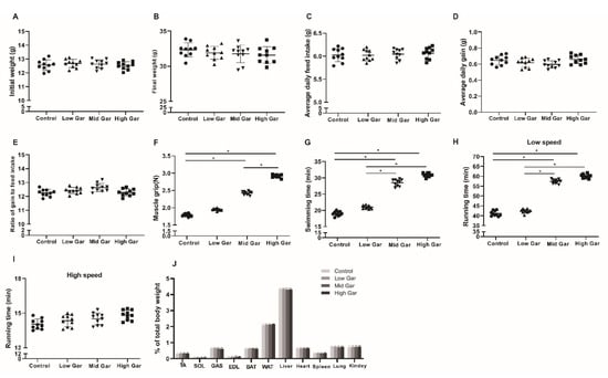 Effects of dietary garcinol on the Initial weight (A), Final weight (B), Average daily feed intake (C), Average daily gain (D), Ratio of gain to feed intake (E), Muscle grip (F), Swimming time (G), low-speed running time (H), high-speed running time (I) and the tissues weight (J) in mice fed 0–500 mg/kg garcinol for 12 weeks. Data are shown as the mean ± SE, n = 10. * Different from the control group, p < 0.05.