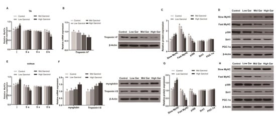 MyHC IIb fast fibers of the TA were decreased by treatment with 500 mg/kg garcinol, while MyHC I slow fibers of the soleus were significantly increased (p < 0.05, Figure 2A,E). Garcinol significantly decreased the mRNA expression of the fast-twitch fiber marker Troponin I-F and increased the mRNA expression of the slow-twitch fiber markers myoglobin and Troponin I-S (p < 0.05, Figure 2B,F). Compared with that in the Low Gar and control groups, the protein expression of slow MyHC in the High and Mid Gar groups was higher (p < 0.05). The Low Gar group had expression levels of fast MyHC and p300 similar to those of the control group (p ≥ 0.05), while the Mid and High groups had lower (p < 0.05) expression levels than the control and Low Gar groups. Moreover, the expression of PGC-1α and Sirt1 in the TA and soleus muscles was not significantly different among all groups (p ≥ 0.05) (Figure 2C–H).