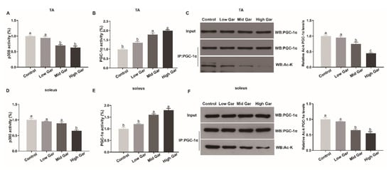 As shown in Figure 3A, the enzyme activity of p300 tended to decrease (p = 0.06) in the Low Gar group, while its activity was significantly decreased (p < 0.05) in the Mid and High Gar groups compared with that in the control group (Figure 3A,D). Compared with that in the Low Gar and control groups, the PGC-1α activity in the High and Mid Gar groups was obviously increased (p < 0.05) (Figure 3B,E). Additionally, the acetylation level of PGC-1α in the garcinol-fed mice was reduced significantly (p < 0.05) compared with that in the control group mice (Figure 3C,F).