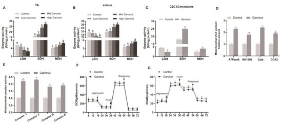 Effects of dietary garcinol on the activity of lactate dehydrogenase (LDH), succinic dehydrogenase (SDH), and malate dehydrogenase (MDH) in TA (A), soleus (B) muscle of mice and C2C12 myotubes (C), respectively. (D,E) Quantification of mitochondrial DNA contents and complex activity. (F,G) Effect of garcinol on oxygen consumption rate and extracellular acidification rate. Data are shown as the mean ± SE, n = 10. * Different from the control group, p < 0.05. Means without a common letter differ, p < 0.05.