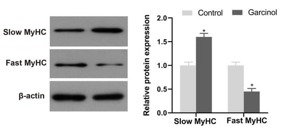 To investigate the role of garcinol in skeletal muscle fiber type-related protein expression, we performed a Western blotting analysis in C2C12 myotubes. As shown in Figure 5A, compared with the control, the protein expression of slow MyHC was up-regulated (p < 0.05) by garcinol in C2C12 myotubes, whereas the fast MyHC protein was down-regulated by garcinol treatments.