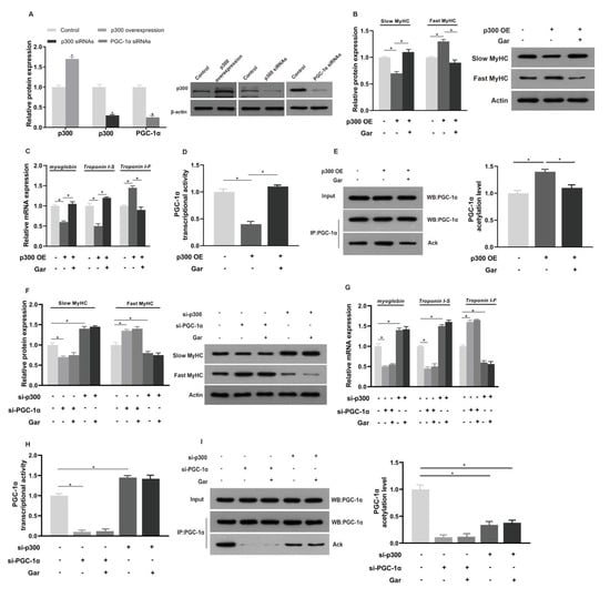 Effects and mechanisms of dietary garcinol on the protein expression of p300 (A,B), Slow MyHC, Fast MyHC (C,D), the activity of PGC-1α (E), the acetylation level of PGC-1α (F) in C2C12 myotubes. The mRNA expression of myoglobin, Troponin I-S, Troponin I-F (G), the activity of PGC-1α (H), the acetylation level of PGC-1α (I) in C2C12 myotubes were transfected with si-p300 or si-PGC-1α. Data are shown as the mean ± SE, n = 10. * Different from the control group, p < 0.05.