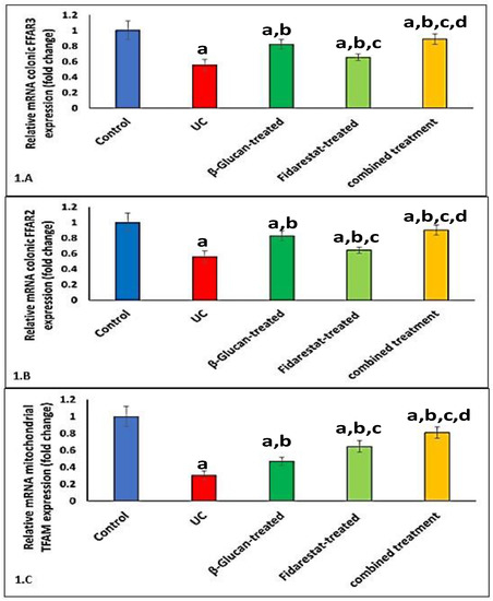 The administration of oxazolone decreased the mRNA expressions of colonic FFAR2, colonic FFAR3, and mitochondrial TFAM in the UC group compared to the control group. However, the addition of β-glucan, fidarestat, or both for 28 days significantly increased the mRNA expressions of colonic FFAR2, colonic FFAR3, and mitochondrial TFAM in the treated groups compared to the untreated UC group (Figure 1).