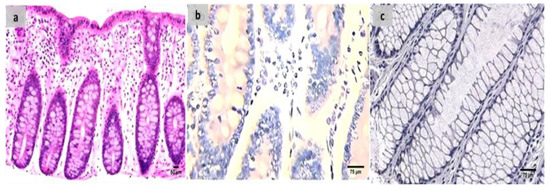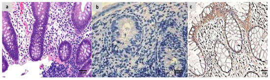 The sections were stained by calprotectin and S100 calcium-binding protein A12 (S100A12) to evaluate inflammation and activity in the studied cases and the control specimens. the control cases demonstrated that all the cases were completely negative for both markers (Figure 2b,c). For active UC studied cases, the score of expression of both markers were positive as seen in Figure 3b,c. both markers were detected in the intramucosal cells together with the stromal and lamina propria inflammatory cells.