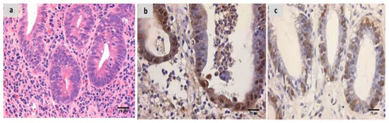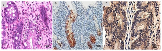 Light microscopy was used to evaluate the immunohistochemical staining, using a 10× objective lens for general inspection and a 20–40× objective lens for specific confirmation. Analyzing the degree of the staining cytoplasmic positivity allowed for a semiquantitative evaluation of the immunoreactivity. Epithelial and inflammatory cells’ immunohistochemical activity was assessed. Six high-power fields identified in the mucosal areas with the greatest expression of calprotectin were used to evaluate intramucosal calprotectin expression. Irrespective of the intensity, cytoplasmic staining was considered a positive expression. Staining was graded semi-quantitatively as negative, weak, or strong. Immunostaining of tumor cells of less than 10% was scored as negative; 10–50% was scored as weak, and 51–100% was scored strong [69,70].