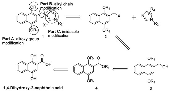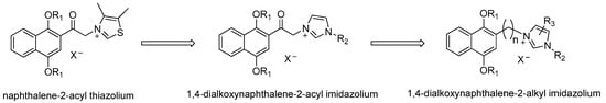In our previous study [Figure 1], various naphthalene-2-acyl thiazolium salts combining the structures of 1,4-dialkoxynaphthalene and thiazole were synthesized, and their activities as AGE (advanced glycation end product) breakers were tested [16]. In this work, the 1,4-dialkoxynaphthalene moiety was found to be of pharmacological significance. Subsequently, an imidazole ring was introduced instead of thiazole to produce 1,4-dialkoxynaphthalene-2-acyl imidazolium salt derivatives, which were confirmed to exhibit antifungal activity [17]. Here, it was confirmed that the combination of the 1,4-dialkoxynaphthalene moiety and imidazolium moiety shows a good pharmacophore. However, there were several problems in the synthesis process of previous studies. The yield in this synthesis was highly dependent on the type of alkoxy group on the naphthalene ring and on the bromination step to produce monobromide, as well as dibromide and tribromide. Therefore, to find a compound that is easy to synthesize and can exhibit various activities, a new target compound was designed and synthesized in which the acyl moiety connecting the naphthalene ring and the imidazole ring was substituted with an alkyl moiety.