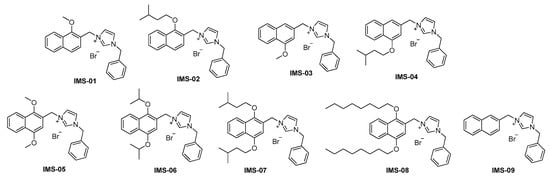 The activity of acyl imidazolium salt is best when the isoamyloxy group is substituted [17]. To confirm that the same result can be obtained in an alkyl imidazolium salt, derivatives substituted with various alkoxy groups in the naphthalene ring were synthesized. After synthesizing the corresponding bromide intermediates in three steps from 1-hydroxy-2-naphthoic acid, methyl 4-hydroxy-2-naphthoate, or 1,4-dihydroxy-2-naphthoic acid (see Scheme S1, Figures S1–S24), IMS-01 to IMS-09 (see Figures S43–S51) were obtained through a subsequent substitution reaction with 1-benzylimidazole [Figure 3].