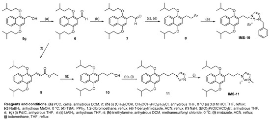 In Part B, the difference in activity as a function of the length of the carbon chain connecting the naphthalene ring and the imidazole ring was investigated. For comparison with IMS-07, IMS-10 and IMS-11, each having an ethylene and propylene moiety between the naphthalene ring and the imidazole ring, were synthesized [Scheme 1]. First, to synthesize IMS-10, synthesis of key aldehyde intermediate 7, in which the number of carbon atoms is increased by one, was attempted through a reduction reaction using DIBAL-H after synthesizing the corresponding cyanide intermediate from 12g [18]. However, this approach did not proceed well. Therefore, we attempted to synthesize intermediate 7 via another method. Aldehyde intermediate 6 was synthesized through PCC oxidation of compound 5g, and the subsequent Wittig reaction of 6 followed by acidic workup yielded key aldehyde intermediate 7 [19]. Intermediate 7 was reduced with NaBH4 and brominated with PBr3 to obtain bromide intermediate 8. However, it was observed that this reaction is inefficient due to its long reaction time and low yield. To overcome this problem, a bromination reaction based on Xiao’s method using Ph3P, TBAI (tetrabutylammonium iodide), and 1,2-dibromoethane was adopted to obtain compound 8 in higher yield [20]. Even for bromide intermediates with low yields in Part A, the yield could be increased by using this method instead of PBr3. Finally, a substitution reaction between bromide 8 and 1-benzylimidazole gave the desired final product, IMS-10 (see Figures S25–S27 and S52). Next, for the synthesis of IMS-11, ester intermediate 9, which had its number of carbons increased by two compared to IMS-07, was prepared through an HWE (Horner–Wadsworth–Emmons) reaction of aldehyde 6 [21]. Then, from intermediate 9, alcohol intermediate 10 was obtained by Pd-catalyzed hydrogenation followed by LiAlH4 reduction. Halogenation of intermediate 10 provided the corresponding bromide in poor yield, which also did not react well with 1-benzylmidazole. Therefore, we made another attempt at synthesizing imidazolium salt. In order to change the hydroxy group to a better leaving group, mesylation was performed to obtain a mesylate [22]. Then, imidazole was attached to synthesize imidazole intermediate 11. Intermediate 11 was then reacted with iodomethane to give the N-methylimidazolium salt, IMS-11 (see Figures S28–S30 and S53) [23].