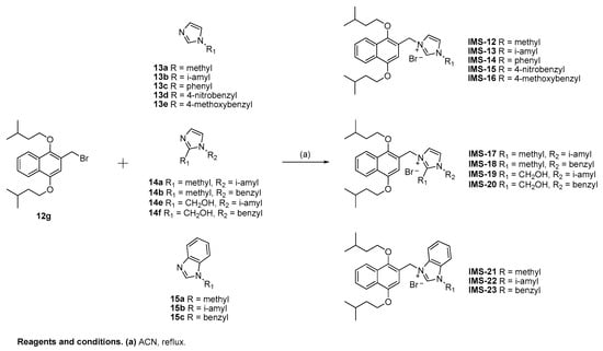 We synthesized IMS derivatives in which various substituents were substituted on the imidazole ring [Scheme 2]. First, derivatives were synthesized with substituents other than a benzyl group attached at the nitrogen position. The substituted imidazoles used were commercially or readily available, such as 1-methyl-1H-imidazole (13a) and 1-phenyl-1H-imidazole (13c), or other synthesized N-substituted imidazoles (13b, 13d, and 13e) (see Scheme S2, Figures S31–S33). Subsequently, IMS-12, IMS-13, IMS-14, IMS-15, and IMS-16 (see Figures S54–S58) were obtained through a substitution reaction with bromide intermediate 12g. Second, we tried to synthesize derivatives with a substituent attached to the position 2 of imidazole. N-Alkylation was performed using 2-methylimidazole and 2-imidazolecarboxaldehyde (see Scheme S2, Figures S34–S39). However, the derivatives synthesized using 2-imidazolecarboxaldehyde (14c and 14d) easily decomposed during the purification process. Therefore, a change was made to synthesize the salt derivatives using 2-imidazolomethanols, 14e and 14f, through a reduction reaction (see Figures S59–S62). Lastly, we tried to introduce benzimidazole to synthesize derivatives substituted at both positions 4 and 5 on the imidazole ring. After N-alkylation (see Scheme S2, Figures S40–S42), the synthesis of the derivatives (IMS-21—IMS-23) was completed through a subsequent substitution reaction with the bromide intermediate 12g (see Figures S63–S65).