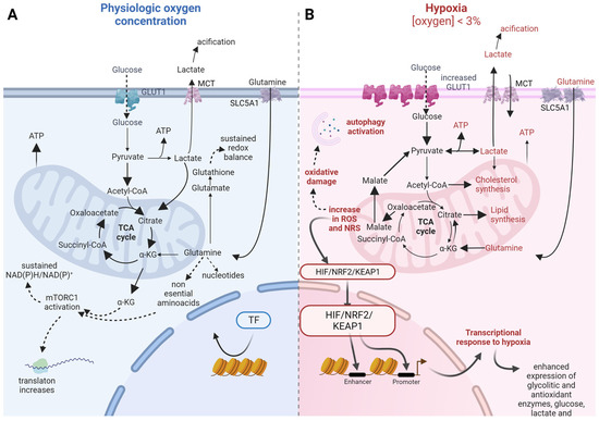 Metabolic adaptations to hypoxia in 3D cultures. Differences in nutrient uptake, main metabolic pathways, biosynthesis, and redox balance between physiological oxygen concentration (A, left blue scheme) and under hypoxia (B, right pink scheme). Solid arrows indicate nutrient flux; if wide, they show increased flux towards those pathways. Dashed arrows indicate indirect causal relationship. Faded color arrows indicate direct causal relationship between processes. GLUT1, glucose transporter 1; MCT, monocarboxylate transporter complex; SLC5A1, solute carrier family 5 member 1; TF, transcription Factor; TCA, tricarboxylic acid cycle; KG, alpha-ketoglutarate; mTORC1, mammalian target of rapamycin complex 1; HIF, hypoxia inducible factor; NRF2, nuclear factor (Erythroid-derived 2)-like 2; KEAP1, Kelch-like ECH-associated protein 1.