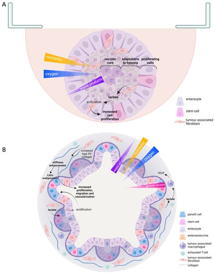 Useful scaffold-free 3D culture features in tumor metabolism study. Schematic representations of hanging drop multicellular intestinal spheroid (A); patient-derived colorectal organoid (B). Oxygen, nutrient, waste products, and growth factors gradients are indicated; color opacity and triangle width indicate high concentration. Cell types are indicated within each scheme legend. Solid arrows represent direct effects; discontinued arrows indicate indirect effects. CAFs, cancer associated fibroblasts; VEGF, vascular endothelial growth factor.