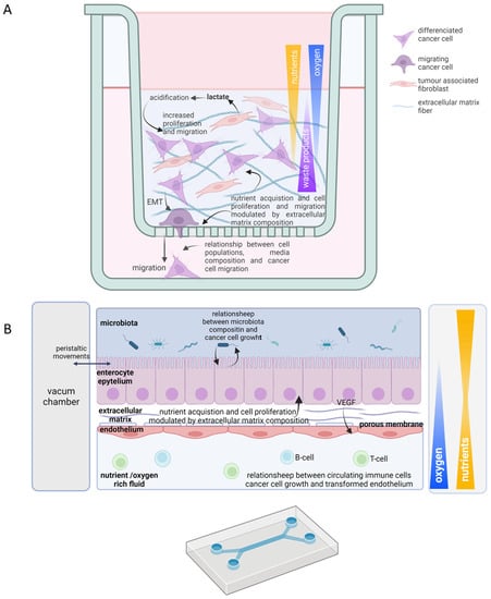 The recent incorporation of microfluidics partially reproduces the pathophysiological scenario in vivo, recreating the chemical gradients and mechanical stimuli. Although the development of plastic structures that mimic tumour, stroma, and vasculature might be technically complex and, depending on the material employed, also expensive, they have successfully represented how breast cancer promotes immune suppression and recreate oxygenation gradient inducing VEGF secretion. They have even reproduced cell migration strategies through the vasculature in lung cancer [,,]. Therefore, those devices acutely show the variety of nutrient acquisition strategies mentioned above (Figure 3B).