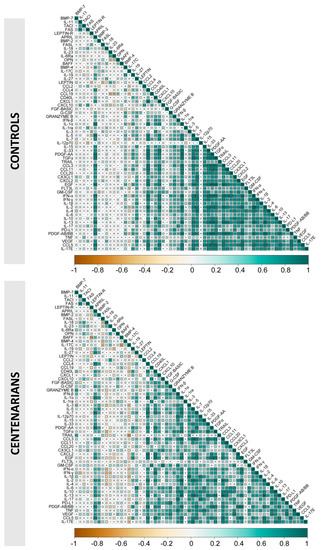 4.3. Analysis of the Correlations among Plasma Cytokines in Young Donors and Centenarians