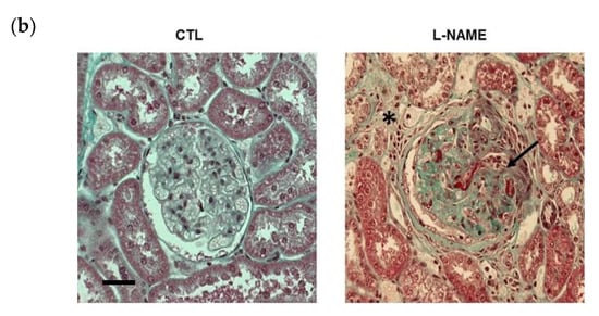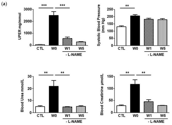 L-NAME impaired the renal function in rats and induced renal injuries. (a) Blood pressure and renal function in L-NAME rat model. Parameters studied included UPER, uremia and creatinemia in CTL, W0, W1, and W5 groups. At the peak of the disease (W0), the rats developed an elevated UPER accompanied by high systolic blood pressure and high levels of urea and serum creatinine. After stopping L-NAME treatment (W1 and W5), renal function recovered to normal (*** p < 0.001 and ** p < 0.01). (b) Histological evaluation of renal tissues. Representative examples of renal samples stained with Masson’s trichrome stain in Control (CTL) and L-NAME-treated rats. Glomerulosclerosis (black arrow) and intertial fibrosis (asterix) on the right photo. Bar = 10 µm.