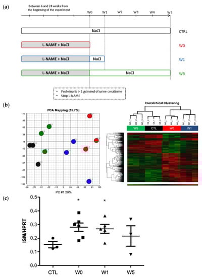 ISM1 gene expression in L-NAME model. (a) Experimental protocol of L-NAME model. When urinary protein excretion ratio was over 1 g/mmol of creatinine, after 6 to 24 weeks, NG-nitro-L-arginine methyl ester (L-NAME) was removed. (b) Left panel. Segregation of transcriptomic data of each animal by principal component analysis: Each animal is represented by a circle in the corresponding group (CTL in black, W0 in red, W1 in blue, and W5 in green). Right panel. Hierarchical grouping of transcriptomic data from each animal: Each line corresponds to a gene and each column to an animal. The red color indicates an overexpression and the green color an under expression. This representation clearly shows a variation of gene expression from one group to another. (c) ISM1 is overexpressed in glomeruli of the L-NAME rat model. mRNA expression of ISM1 from kidney of CTL rats, L-NAME treated rats (W0), 1 week L-NAME removal rats (W1), and 5 weeks L-NAME removal rats (W5). mRNA of ISM1 is significantly overexpressed in the kidney of W0 and W1 L-NAME rats (* p < 0.05 vs control group).
