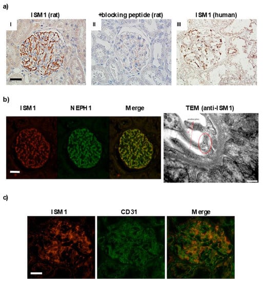 Physiological expression of ISM1 in rodents and human kidneys. (a) Glomerular expression of ISM1 in kidney from rats (I,II) and human (III). ISM1 is expressed exclusively in podocytes. (b) ISM1 expression is localized in podocytes. Immunofluorescence showing colocalization between ISM1 and nephrin. Immunogold electron microscopy: ISM1 is localized in the cytoplasm (circled in red) and in the foot process of podocytes (red arrow). (c) ISM1 colocalized poorly with the endothelial cell marker CD31. Bar = 10 µm and 400 nm for TEM.