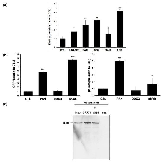 Expression of ISM1 and its receptors in different models of glomerulopathies. Estimation by RT-qPCR (n = 6): (a) ISM1 expression in different models of proteinuria (L-NAME (W0), doxorubicin, puromycin, obesity, and LPS. Values normalized to CTL; (b) Expression of GRP78 (left) and integrin-β5 (right) in doxorubicin, puromycin, and obesity models. *, p < 0.05 vs CTL **, p < 0.01 vs CTL ***, p < 0.001 vs CTL (c) Interaction between ISM1 and its GRP78 and integrin αvβ5 receptors in cultured podocytes. Immunoprecipitation (IP) of GRP78 and integrin αvβ5 using podocyte cells and then, Western blot of ISM1. Negative control with unspecific antibody. The ISM1 interacts with its receptors in podocytes, in basal conditions, (n = 2).