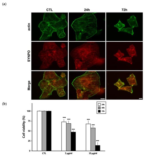 To determine the degree of damage to podocytes, we examined the effect of ISM1 on the structure of the actin cytoskeleton, as well as on cell viability. To determine the degree of damage to podocytes, we examined the effect of ISM1 on the structure of the actin cytoskeleton, as well as on cell viability. Loss of F-actin stress fibers in cultured podocytes mimics changes in podocytes in vivo that are primarily characterized by a peripheral distribution of F-actin and a delocalization of synaptopodin (SYNPO), an actin-associated protein [20]. In our study, the distribution of F-actin and SYNPO was significantly modified by the strongest stimuli at high doses of ISM1 (1 µM) and longer incubations (72 h). Under these conditions, actin adopted a subcortical distribution just beneath the plasma membrane, while the presence of F-fibers was considerably reduced, which is compatible with destabilization of the podocyte cytoskeleton (Figure 5a).