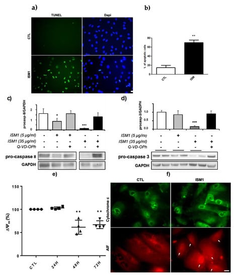 ISM1 induces apoptosis in podocytes. (a) Estimation of ISM1-induced apoptosis by TUNEL assay after un strong stimulus ISM1 (35 µg/mL) for 72 h. Cells were observed under fluorescence microscopy. (b) Apopotic cells were quantified. ISM1 induced an emergence of TUNEL positive cells corresponding to apoptotic cells (** p < 0.01 vs control group; n = 3). (c,d) Evidence of caspases activation. Representative immunoblots with quantitative data of densitometry are shown in (c) for caspase 8 and in (d) for caspase 3. ISM1induced the degradation of pro-caspases 8 and 3 (** p< 0.01; * p < 0.05 vs control group; n = 4 blots) this was inhibited by QVD-OPh. (e) ISM1 decreases the mitochondrial membrane potential of podocytes (ΔΨm). Podocytes were treated with ISM1 (35 µg/mL) and quantification of ΔΨm was assessed by the JC-1 probe. ISM1 decreased significantly the ΔΨm of podocytes from 48 h to 72 h (*** p < 0.01; ** p < 0.01 vs control group). (f) AIF was released from mitochondria to the cytosol and the nucleus after ISM1 treatment (arrows). In contrast, cytochrome c remained confined in mitochondria after ISM1 treatment. Bars = 50 µm for (a) and 20 µm for (f).